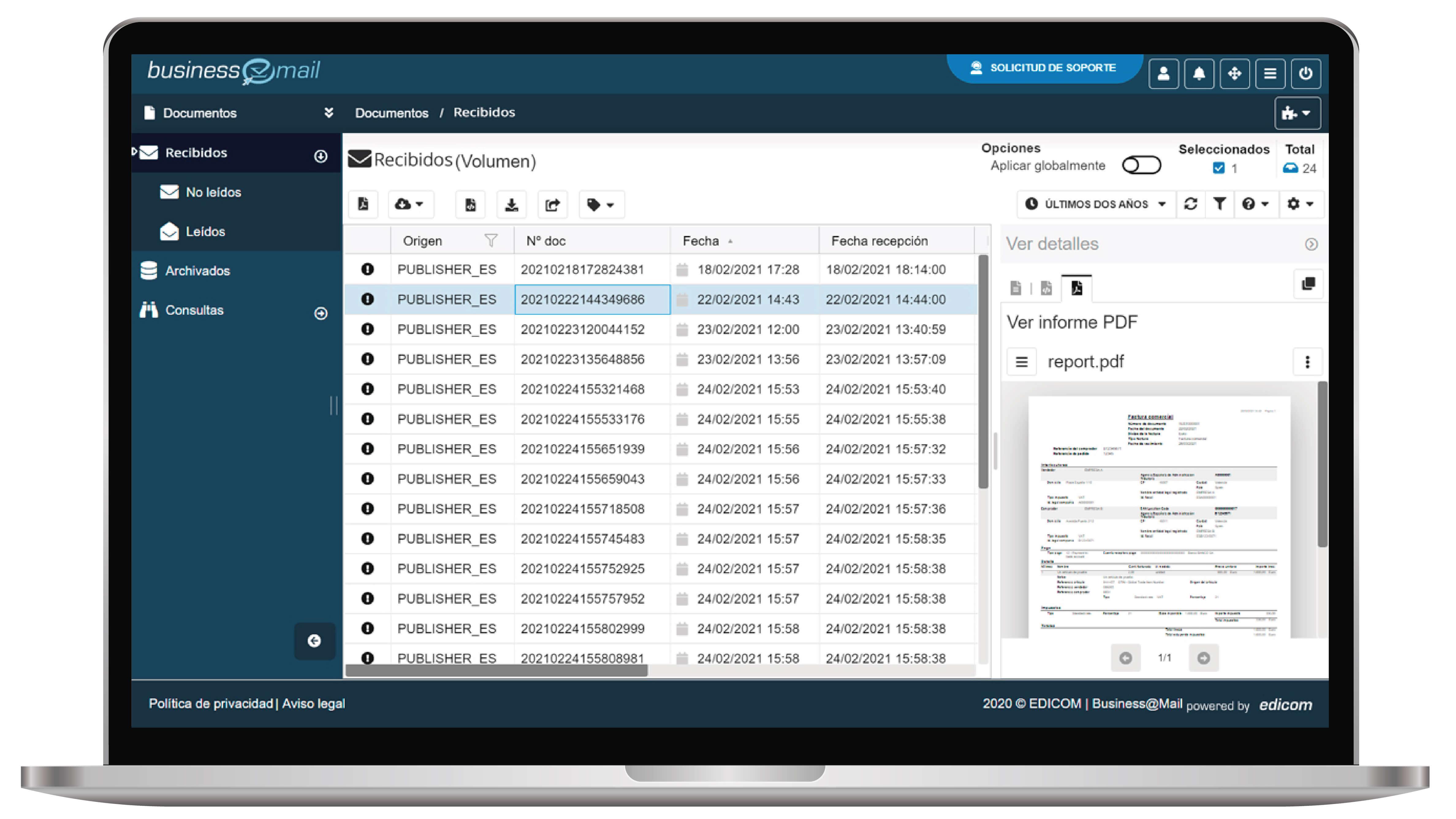 ¿Cansado de imprimir, empacar y esperar días para que tus facturas, órdenes de compra o nóminas lleguen a destino? Business@Mail lo hace instantáneo y sencillo. Conecta tu sistema de gestión y envía todos tus documentos electrónicos automáticamente a clientes, proveedores y empleados, sin cambiar tu forma de trabajar. Ellos reciben un correo con acceso seguro al documento, tú sabes exactamente cuándo lo consultan o descargan. Olvídate del papel, los costos de envío y la incertidumbre.